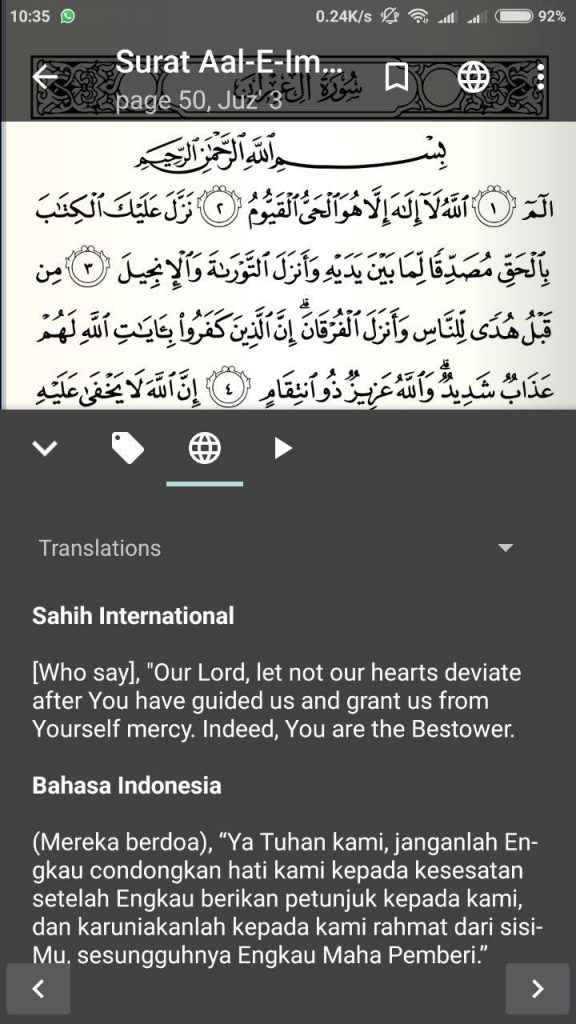 Jika anda ingin mengerti arti dari bacaan AL Qur’an yang sedang sobat baca, bisa dengan fitur terjemahan yang sangat mudah digunakan. Pertama di menu setting (klik titik 3 dibagian pojok kanan atas), bagian translation, pilih bahasa apa aja yang akan didownload untuk terjemahannya. Kemudian untuk membukanya, bisa per-ayat atau per-halaman.